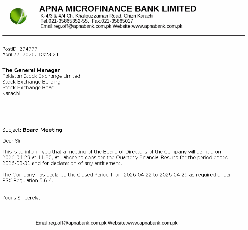 Apna Microfinance Bank Limited was incorporated on May 08, 2003 as a public limited Bank under the repealed Companies Ordinance, 1984 now the "Companies Act, 2017" (the Companies Act). The Bank was granted certificate of commencement of business on December 28, 2004 and started its operations on January 01, 2005. The Bank’s principal business is to provide microfinance services to the poor and underserved segment of the society as envisaged under the Microfinance Institutions Ordinance, 2001.