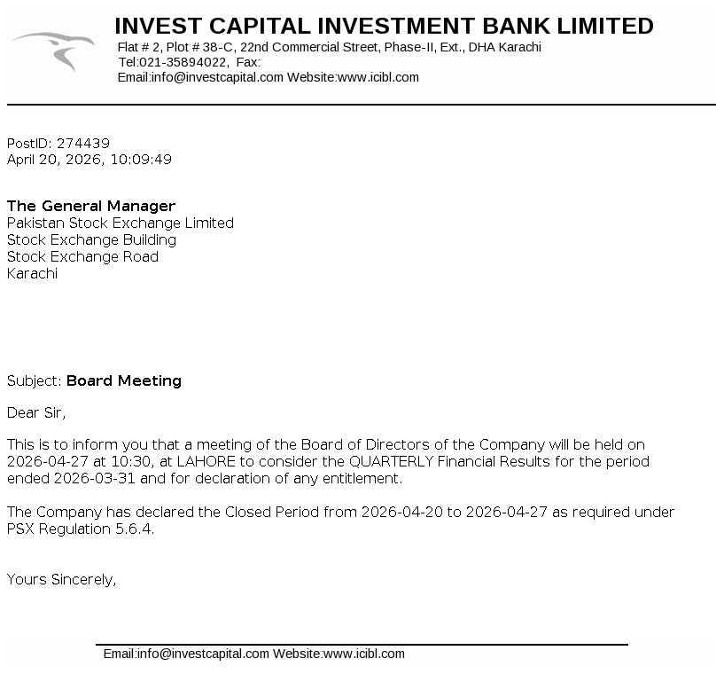 NOTICE OF 87TH BOARD MEETING OF ICIBL at 20-Apr-2026